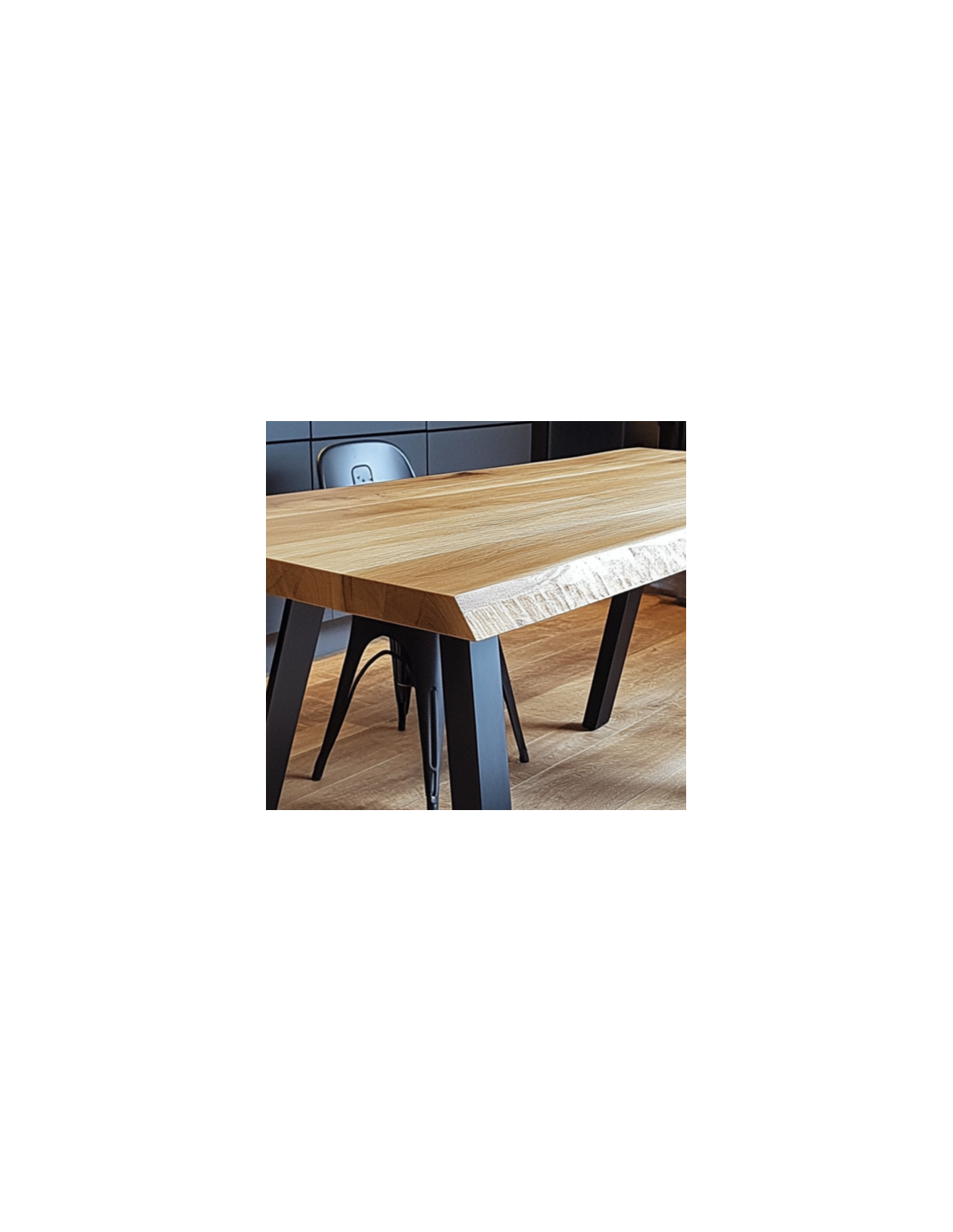 Nowoczesny Stół Dębowy z Cięciem na Krawędzi – Blat o wymiarach 160×90 cm i grubości 4 cm, wykonany z litego drewna dębowego, w połączeniu z 4 stalowymi nogami w nowoczesnym stylu. Wysokość całkowita stołu to 78 cm. Idealny do jadalni, salonu lub biura, łączący elegancję z trwałością.