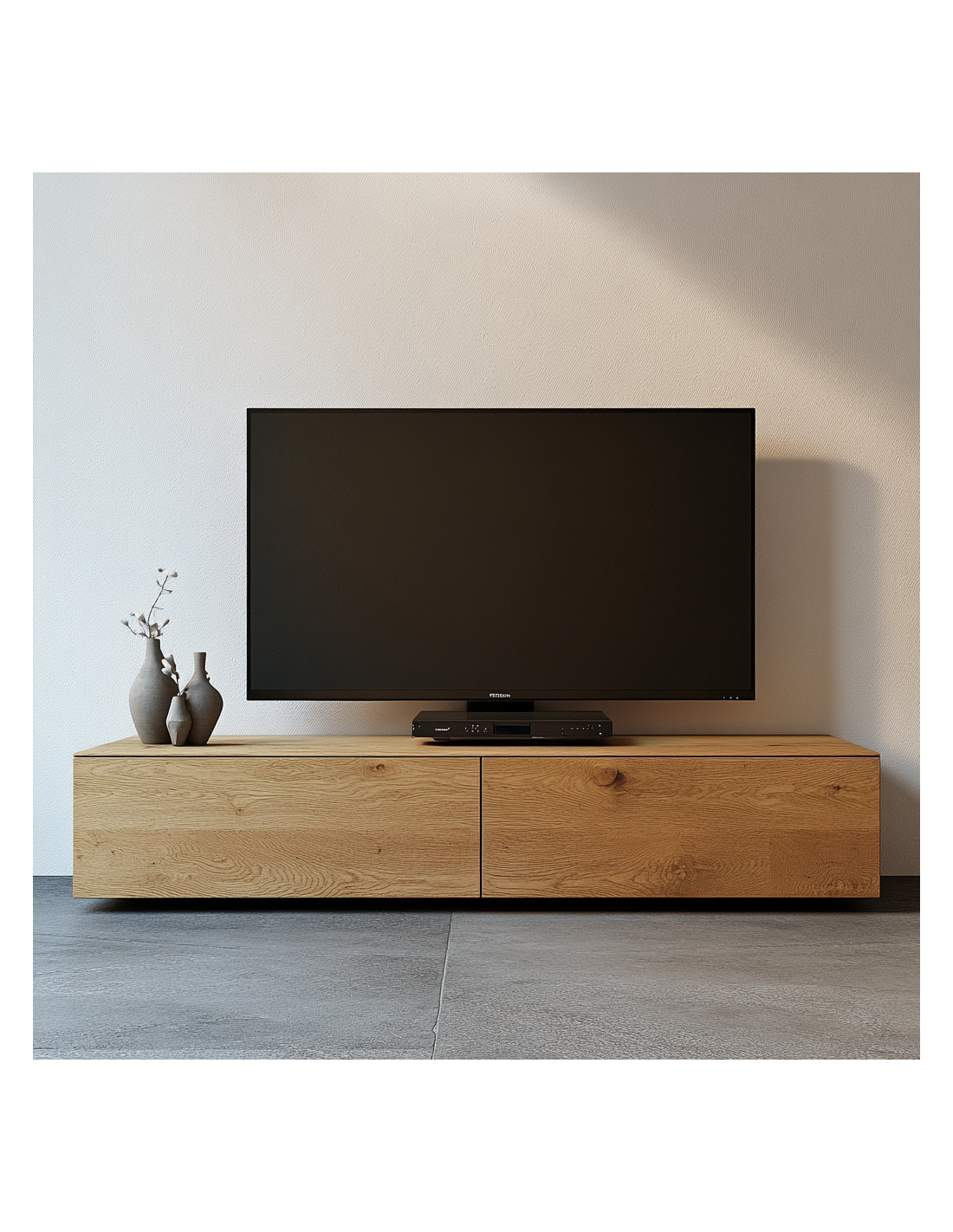 Podwieszana szafka RTV z 100% litego drewna dębowego, wyposażona w dwie szafki. Prosty i elegancki design o wymiarach 200x45x42,5 cm, idealny do nowoczesnych i klasycznych wnętrz.